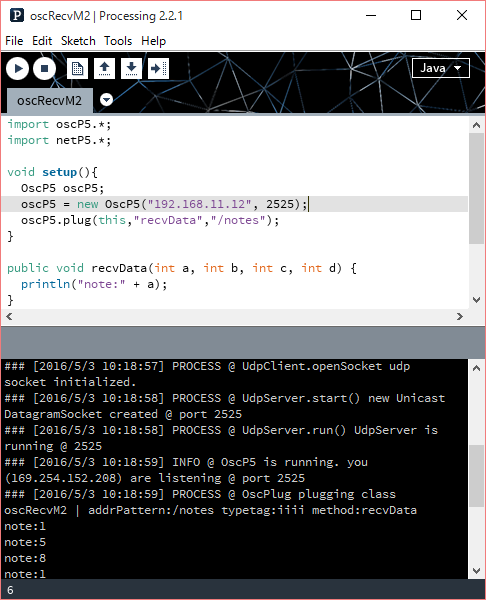 これの受信確認は、今回はメディアアートの世界でよく使われるProcessingを使いました。