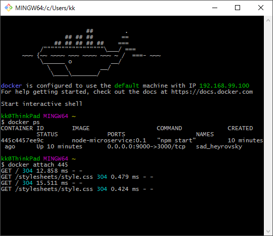 docker run -d -w /microservice -p 9000:3000 node-microservice:0.1 npm start