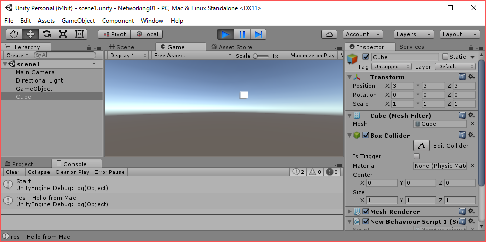 using UnityEngine; using System.Collections; using UnityEngine.Networking; public class NewBehaviourScript1 : MonoBehaviour { class Msg { public const short Text = MsgType.Highest + 1; } class Message : MessageBase { public string Text; } void Start () { Debug.Log("Start!"); NetworkServer.Reset(); NetworkServer.RegisterHandler(Msg.Text, networkMessage => { var mes = networkMessage.ReadMessage<Message>(); Debug.Log("recv:" + mes.Text); networkMessage.conn.Send(Msg.Text, new Message() { Text = "Hello from Mac" }); }); NetworkServer.Listen("0.0.0.0", 7005); } void Update () { } } |