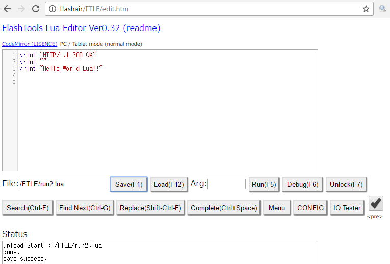 FlashTools.luaをクリックしLuaエディタを立ち上げ、プログラムを記述し保存します。