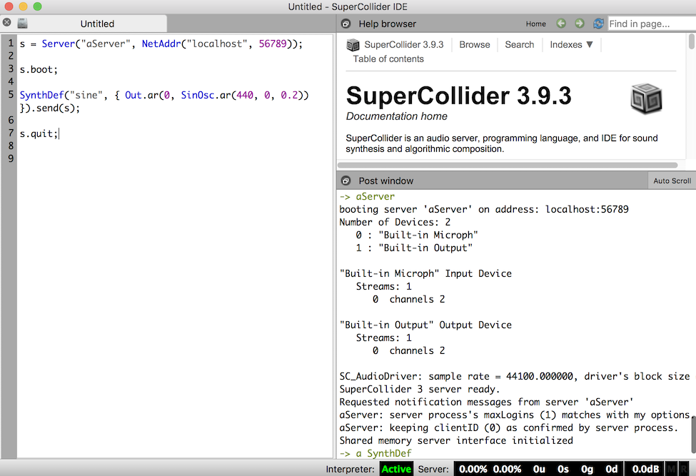 SuperColliderという音響合成処理ができるアプリケーションのサーバ機能を使った記録です。