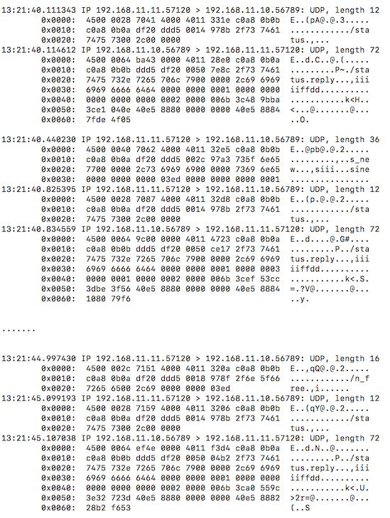 以下がラズパイでtcpdumpを実行した結果です。サーバ接続中は、status-replyを繰り返しています。s_newとn_freeが確認できます、