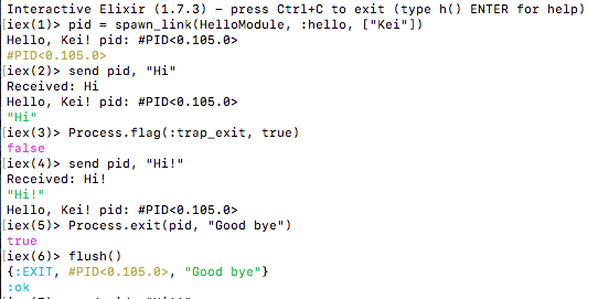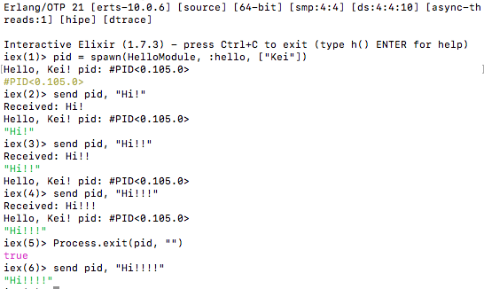 defmodule HelloModule do def hello(name) do IO.puts "Hello, #{name}! pid: #{inspect self()}" receive do message -> IO.puts "Received: #{message}" hello(name) end end end |