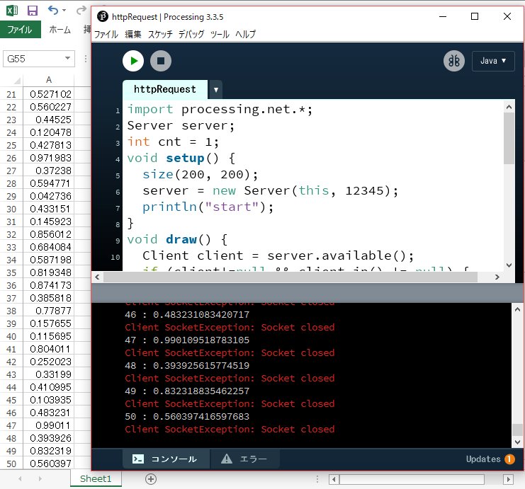 A列のデータ(=RAND()で生成)50行分を100ms間隔で送信します。受信側はProcessingアプリです。