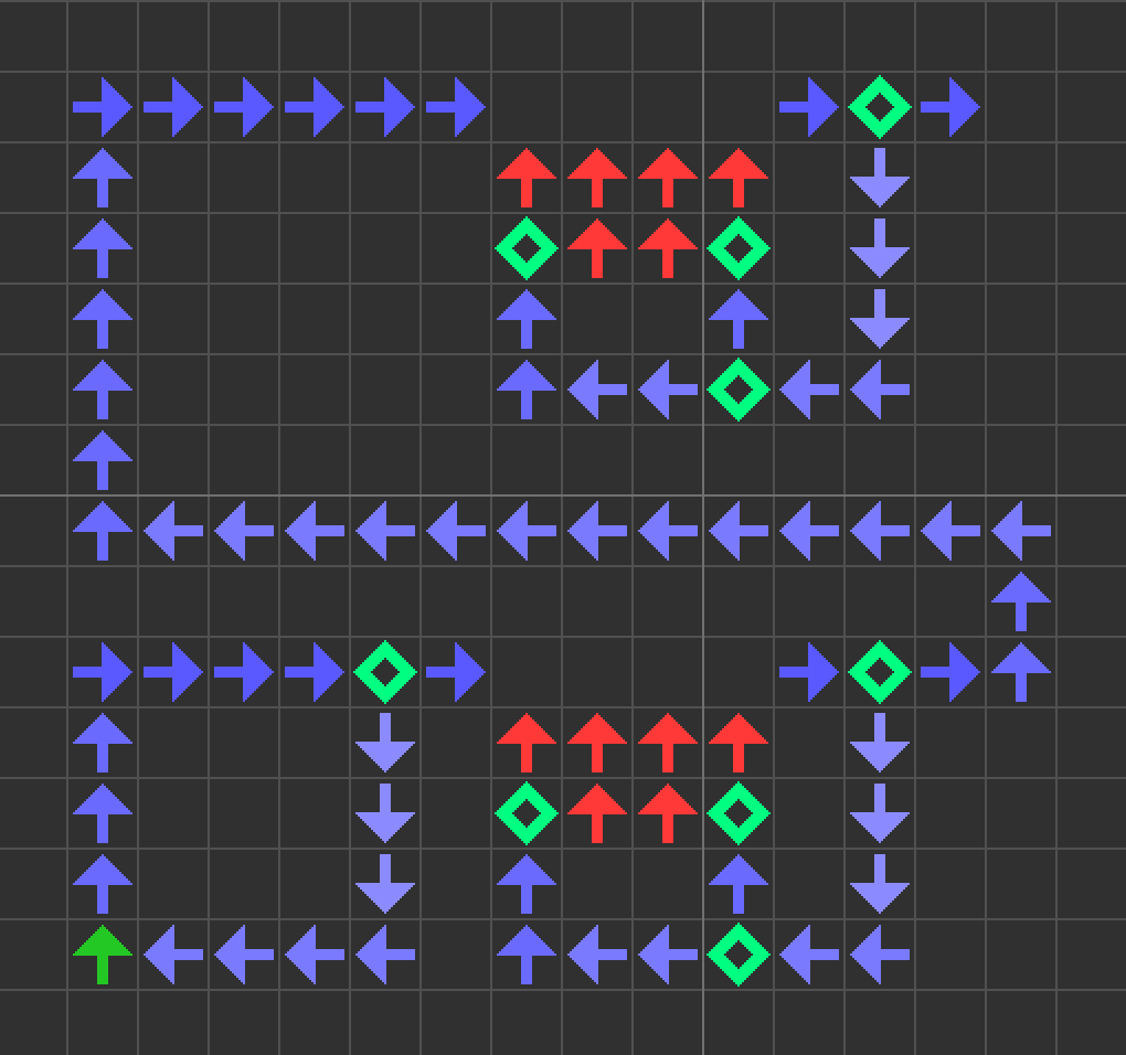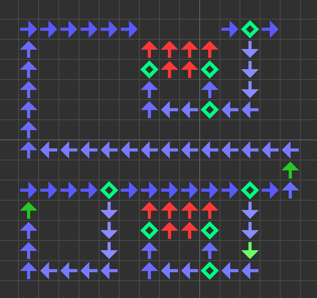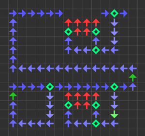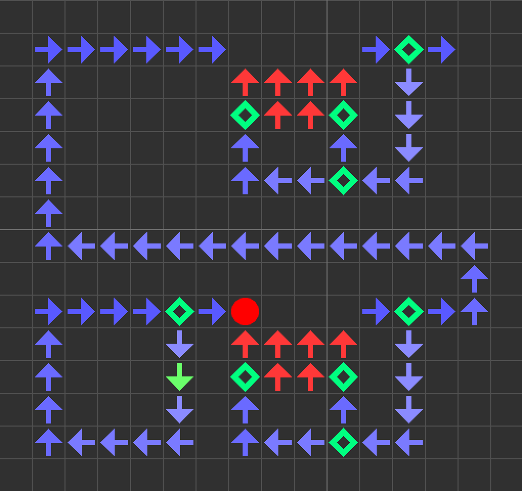 動画でないのでわかりくいですが、左下の四角形を緑の矢印がぐるぐると回り右の伝播していきます。