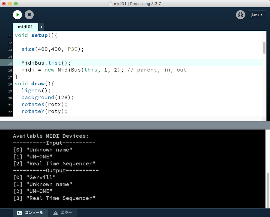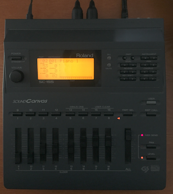 環境: Roland SC-155, Roland UM-ONE(MIDI I/F), Processing 3.3.7 / macOS High Sierra
