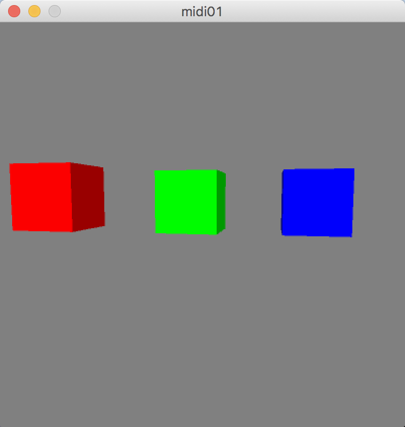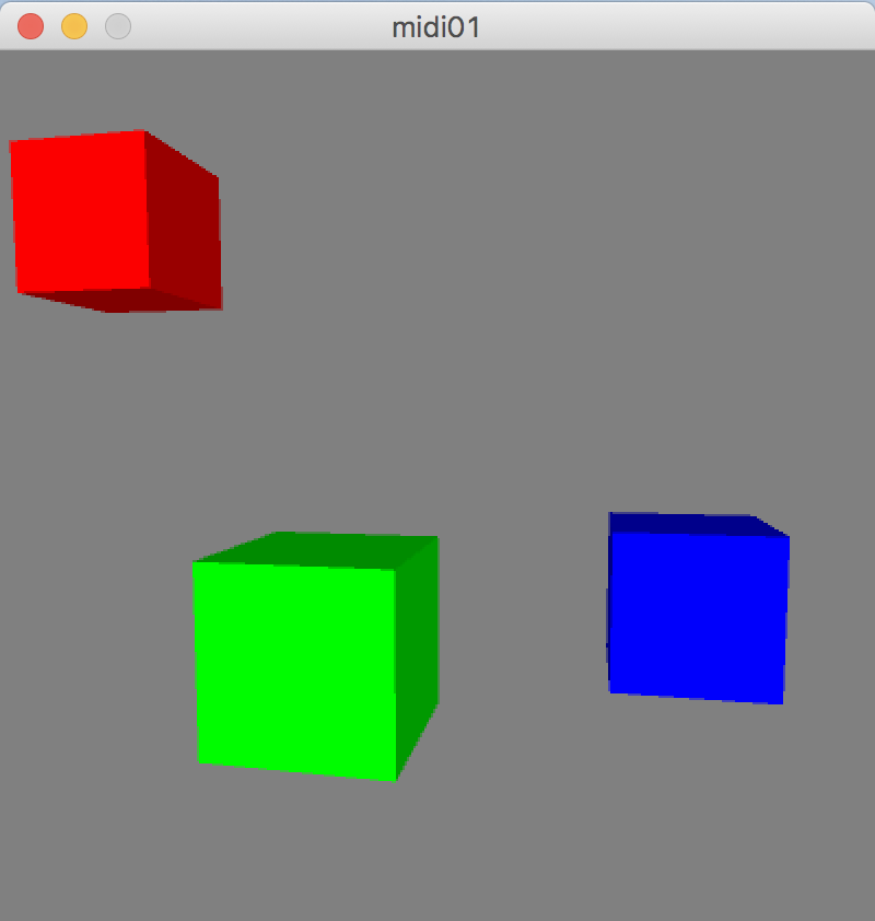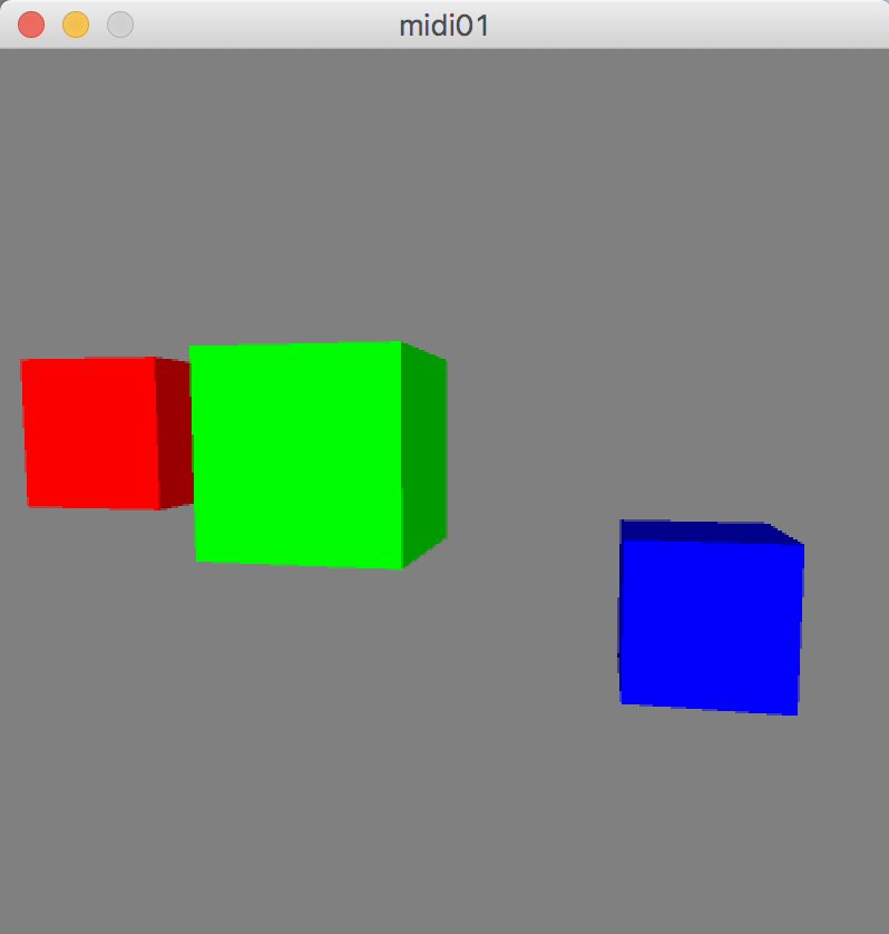import themidibus.*; MidiBus midi; float rotx = 0; float roty = 0; int p1 = 100, p2 = 0, p3 = 0; int p4 = 200, p5 = 0, p6 = 0; int p7 = 300, p8 = 0, p9 = 0; void setup(){ size(400,400, P3D); MidiBus.list(); midi = new MidiBus(this, 1, 2); // parent, in, out } void draw(){ lights(); background(128); rotateX(rotx); rotateY(roty); pushMatrix(); translate(p1, p2, p3); noStroke(); fill(255, 0, 0); box(50, 50, 50); popMatrix(); pushMatrix(); translate(p4, p5, p6); noStroke(); fill(0, 255, 0); box(50, 50, 50); popMatrix(); pushMatrix(); translate(p7, p8, p9); noStroke(); fill(0, 0, 255); box(50, 50, 50); popMatrix(); } void mouseDragged(){ rotx += (mouseY - pmouseY) * 0.01; roty += (pmouseX - mouseX) * 0.01; } void mousePressed(){ //midiout test midi.sendNoteOn(0, 64, 127); //ch, note, velocity delay(500); midi.sendNoteOff(0, 64, 127); } void controllerChange(int ch, int num, int val) { println(ch + ":" + num + ":" + val); switch(ch){ case 1: p2 = val + 100; break; case 2: p5 = val + 100; break; case 3: p8 = val + 100; break; case 4: p3 = val; break; case 5: p6 = val; break; case 6: p9 = val; break; } } |