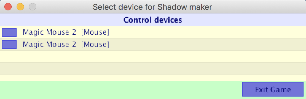 import org.gamecontrolplus.gui.*; import org.gamecontrolplus.*; ControlIO control; ControlDevice stick; float px1, py1, px2, py2; ArrayList<PVector> shadows = new ArrayList<PVector>(); ArrayList<PVector> trail = new ArrayList<PVector>(); public void setup() { size(400, 400); control = ControlIO.getInstance(this); stick = control.getMatchedDevice("joystick"); if (stick == null) { println("No suitable device configured"); System.exit(-1); } } public void getUserInput() { px1 = map(stick.getSlider(0).getValue(), -1, 1, 0, width); py1 = map(stick.getSlider(1).getValue(), -1, 1, 0, height); px2 = map(stick.getSlider(2).getValue(), -1, 1, 0, width); py2 = map(stick.getSlider(3).getValue(), -1, 1, 0, height); boolean b1 = stick.getButton(0).pressed(); //triangle boolean b2 = stick.getButton(1).pressed(); //circle boolean b3 = stick.getButton(2).pressed(); //x-mark boolean b4 = stick.getButton(3).pressed(); //square boolean b5 = stick.getButton(4).pressed(); //L2 boolean b6 = stick.getButton(5).pressed(); //R2 boolean b7 = stick.getButton(6).pressed(); //L1 boolean b8 = stick.getButton(7).pressed(); //R1 boolean b9 = stick.getButton(8).pressed(); //start boolean b10 = stick.getButton(9).pressed(); //select println(b1 + "," + b2 + "," + b3 + "," + b4 + "," + b5 + "," + b6 + "," + b7 + "," + b8 + "," + b9 + "," + b10); } public void draw() { getUserInput(); // Polling background(255, 255, 240); noStroke(); fill(255, 64, 64, 255); ellipse(px1, py1, 20, 20); fill(64, 64, 255, 255); ellipse(px2, py2, 20, 20); } |