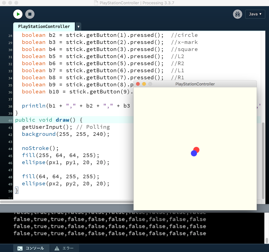 コードはProcessingのライブラリ(Game Control Plus 1.2.1)を使い、そのサンプルコードを参考にしました。