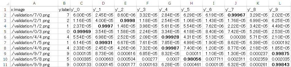 下記評価結果で、ラベルが示す数値が1.0の確率に近い数値を示しているのが確認されます