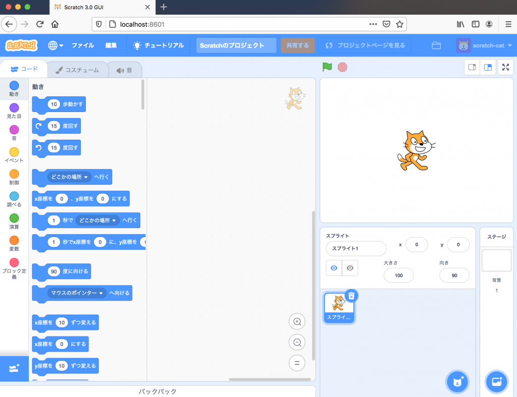まずはScratch3のオフィシャルサイトにあるアイコンの画像やコードをそのまま使って動かしてみました。