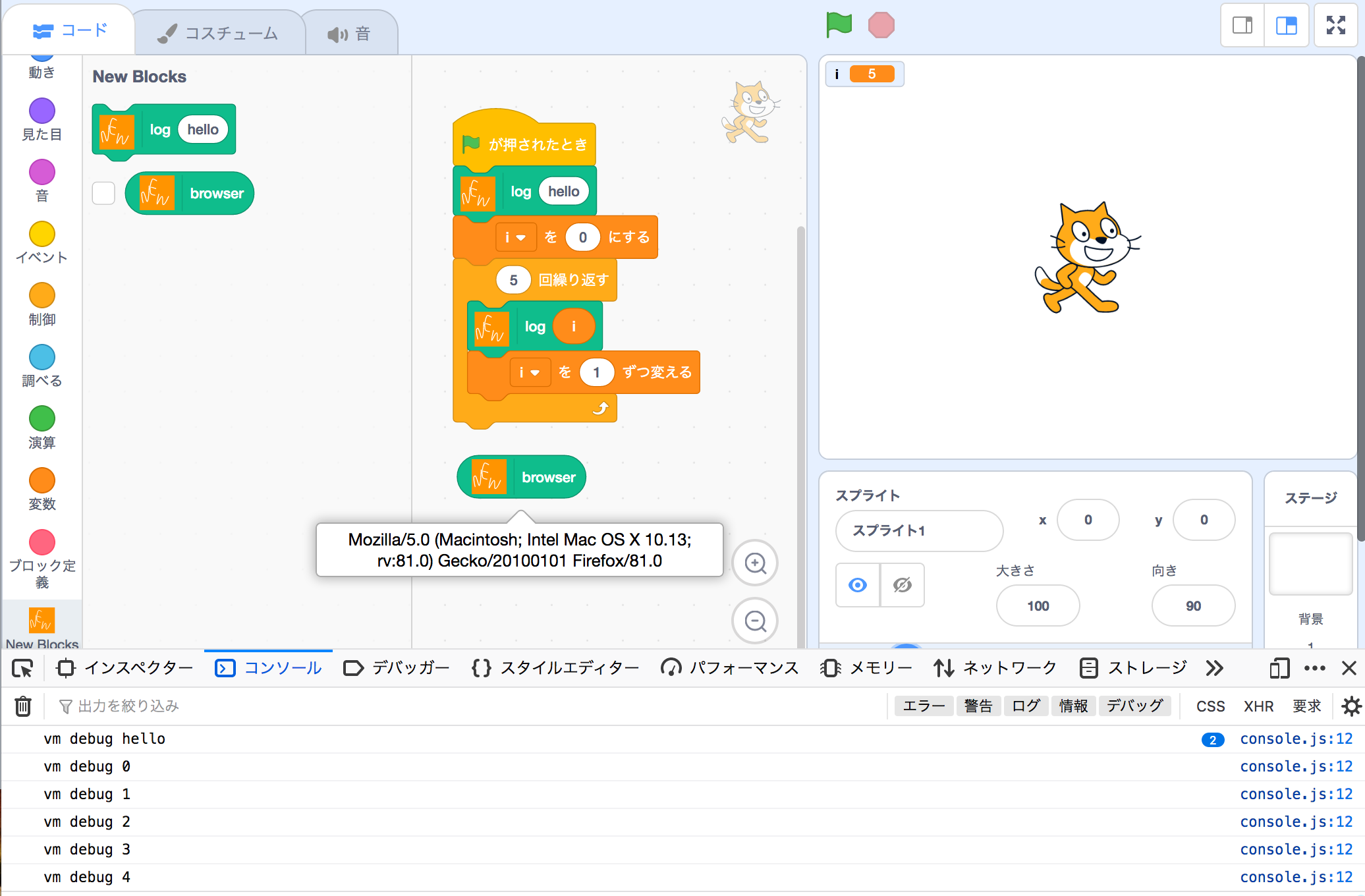ここにあるサンプルの拡張機能は、NewBlocksという名前で、入力した内容をconsole.logに出力するブロックと、ブラウザのUserAgentを出力するブロックです。