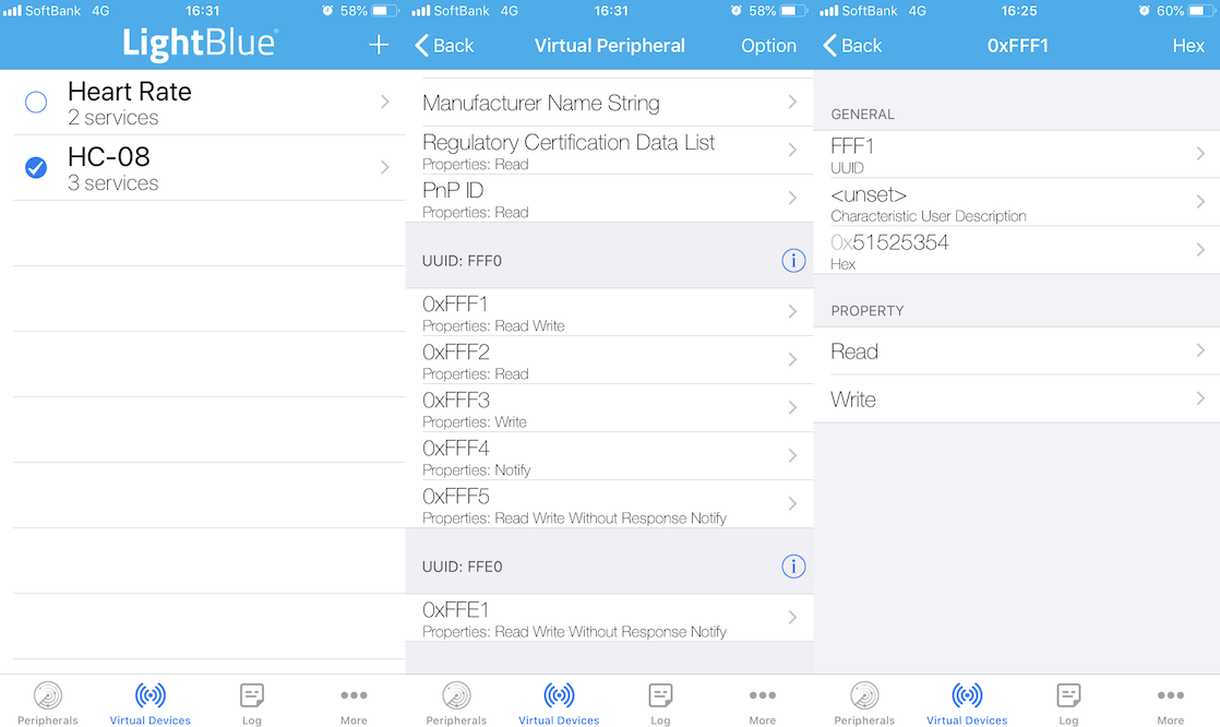 ここでは上記スキャンで検出した LightBlue の VirtualDevice HC-08に接続してみました。